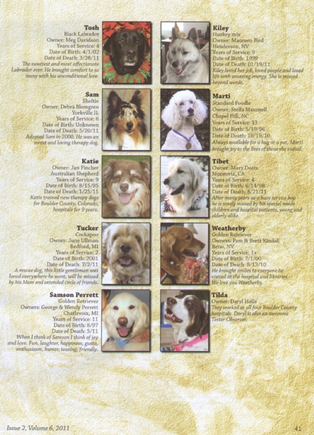 The date of Friday, August 24th marks ONE YEAR since Tilda passed. For those of you that have Tilda’s calendar, you will see the date is identified. The August 2012 calendar picture of Tilda brings back lots of great memories with her. She just love fruits and veggies and her favorites were broccoli and pineapple. She had this wonderful stare and if she could hold it long enough, her thoughts would finally get my attention as they penetrated. That dog knew how to “reach into a person” and get her point across and guess that is why she was so remarkable as a therapy dog.