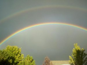 Original August 30 rainbow at our house put together by Margaret from the 3 photos taken that day. Thank you, Margaret. It really shows how large this double rainbow was and how Tilda was trying to get our attention.